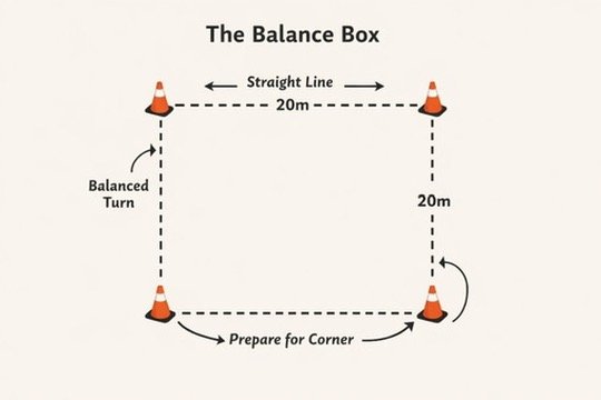Place four cones or markers in the arena to create a square approximately 20 meters by 20 meters. Each side of the square becomes a straight line, and each corner becomes a deliberate turn.